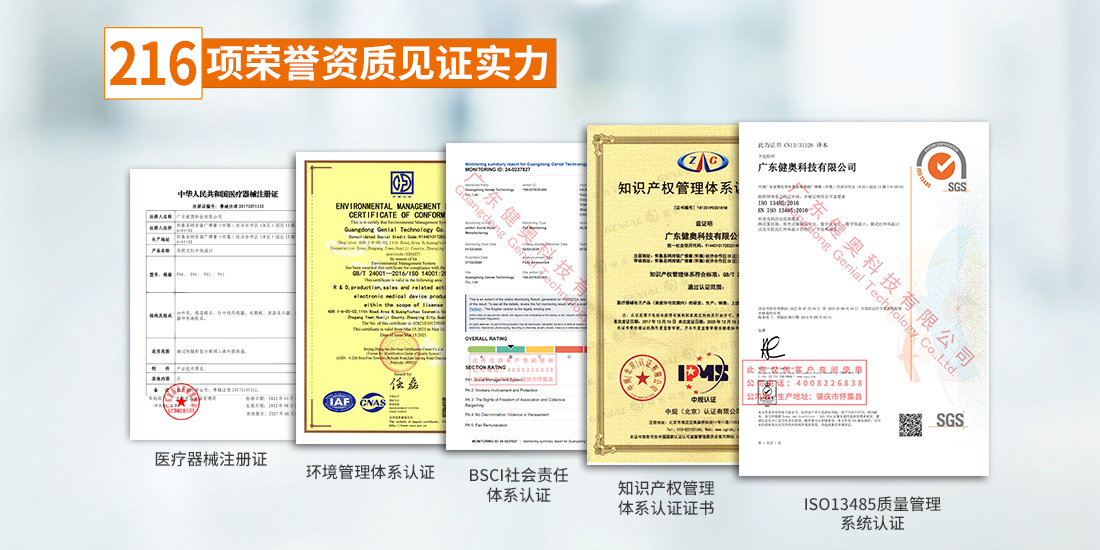 不斷研發(fā)創(chuàng)新,企業(yè)已經(jīng)獲得216項榮譽資質(zhì),并且通過了ISO 13485 、ISO 45001、 ISO 14001、GB/T  29490知識產(chǎn)權(quán)管理體系認證、BSCI社會責任體系認證;